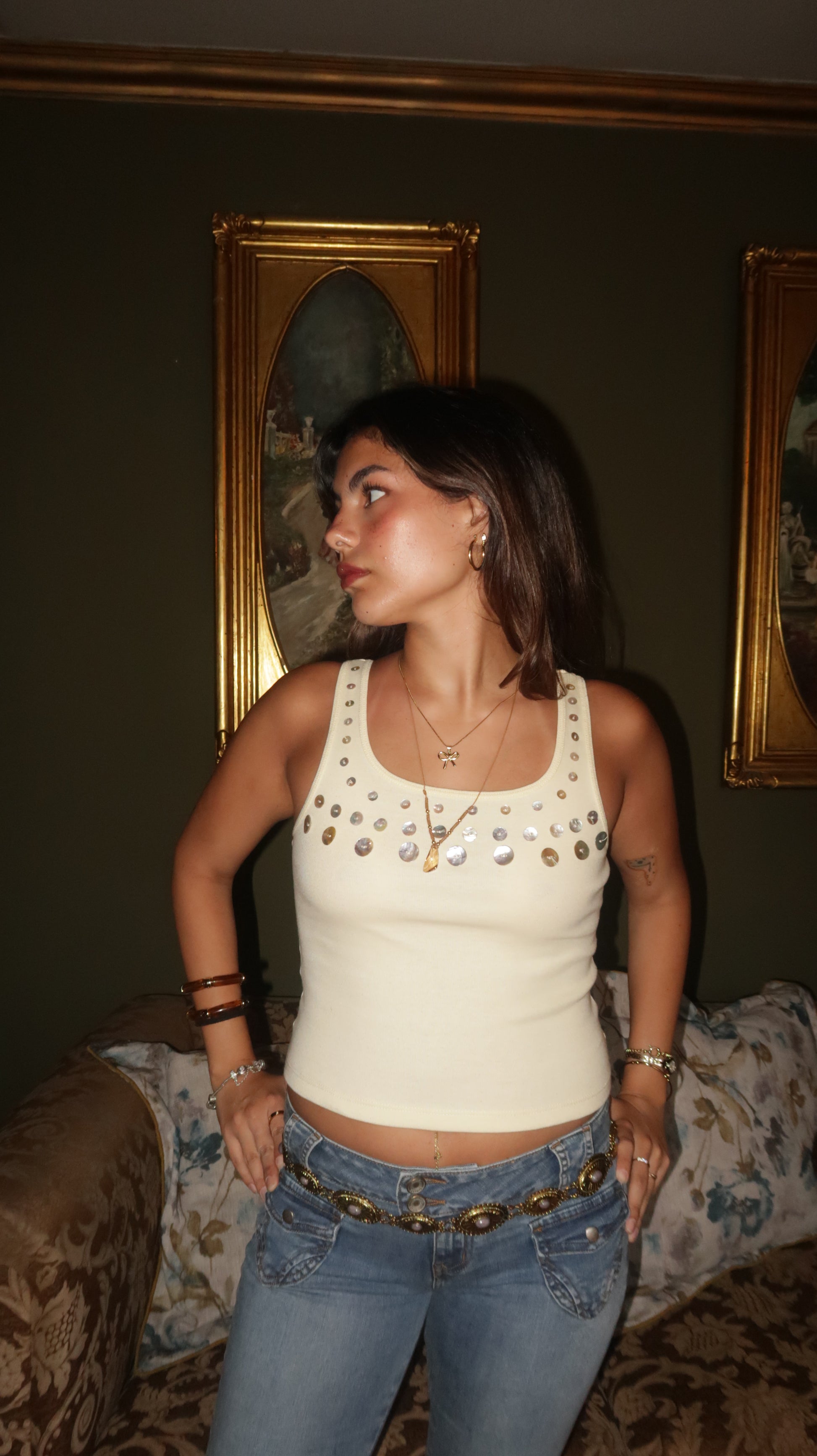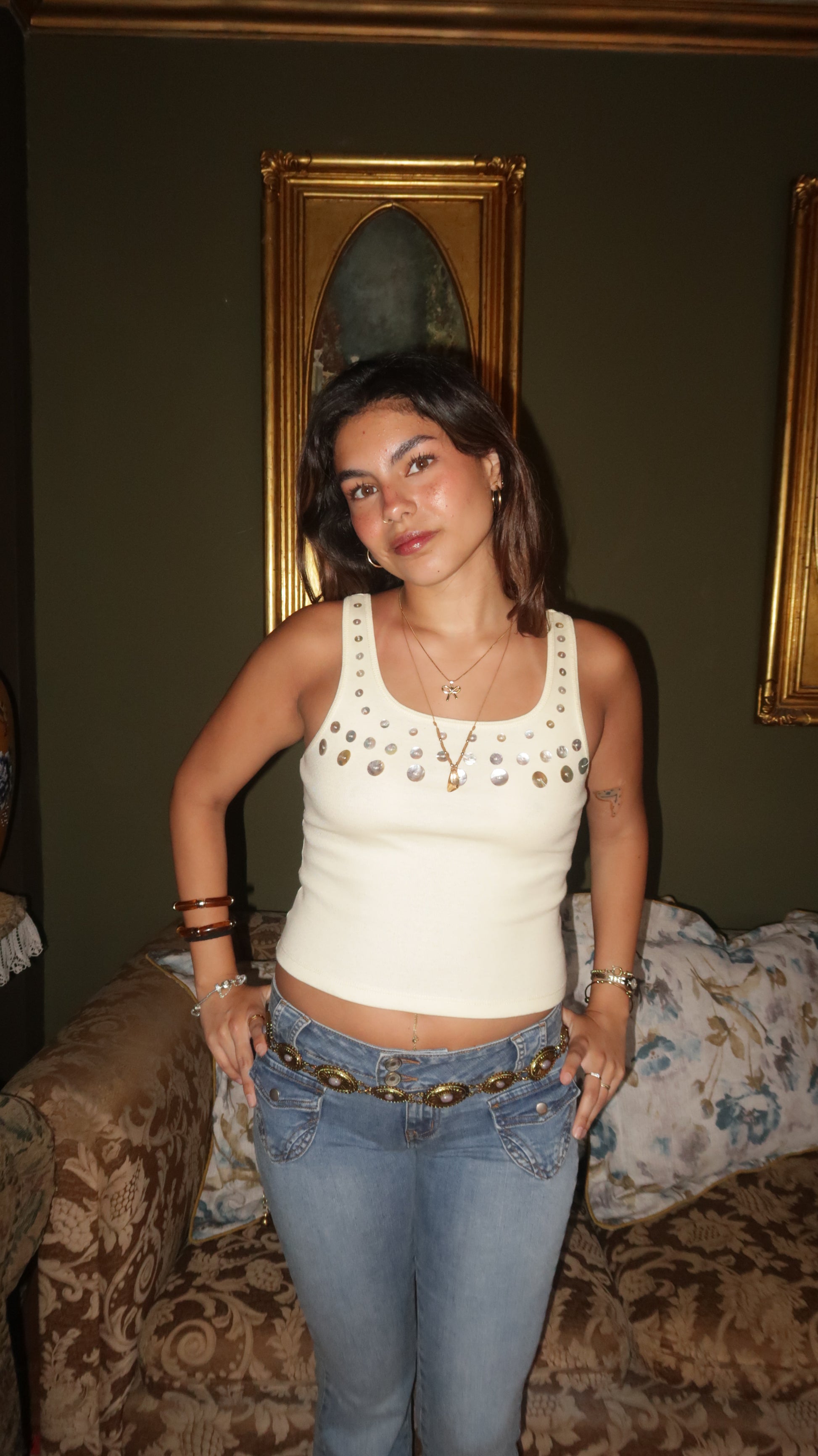 Tank Top con fit perfecto con detalle de botones de concha de Nacar bordados a Mano.